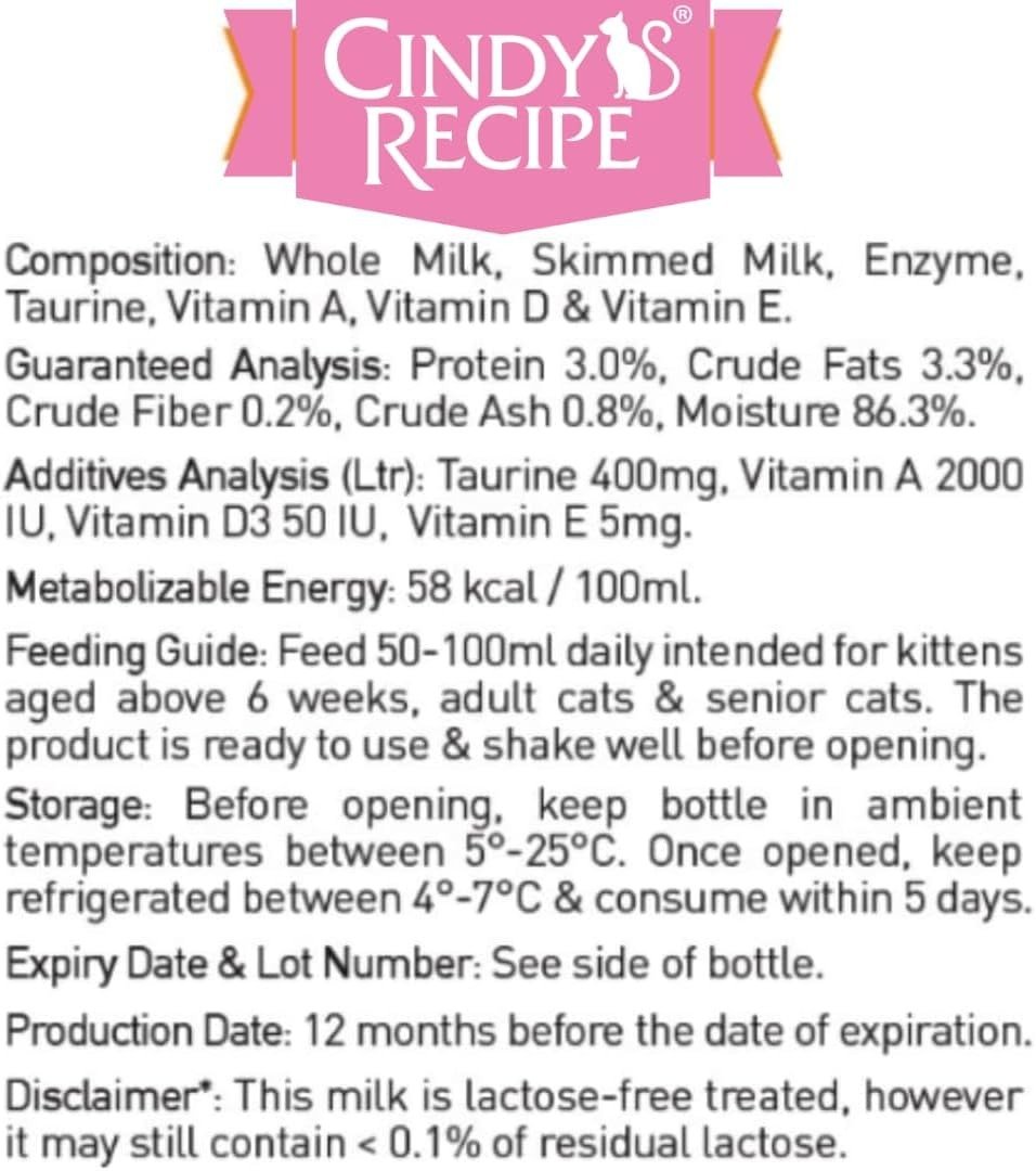 حليب Cindy’s Recipe للقطط والقطط الصغيرة 250 مل – 12 حبه كرتون