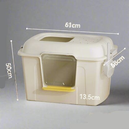 يتميز الصندوق ببوابة بلاستيكية سهلة الدخول والخروج للقطط، تمنع انتشار رائحة الفضلات ويمكن إزالتها عند الحاجة، بالإضافة إلى مخرج علوي يقلل من انتشار حبات الرمل خارج الصندوق.